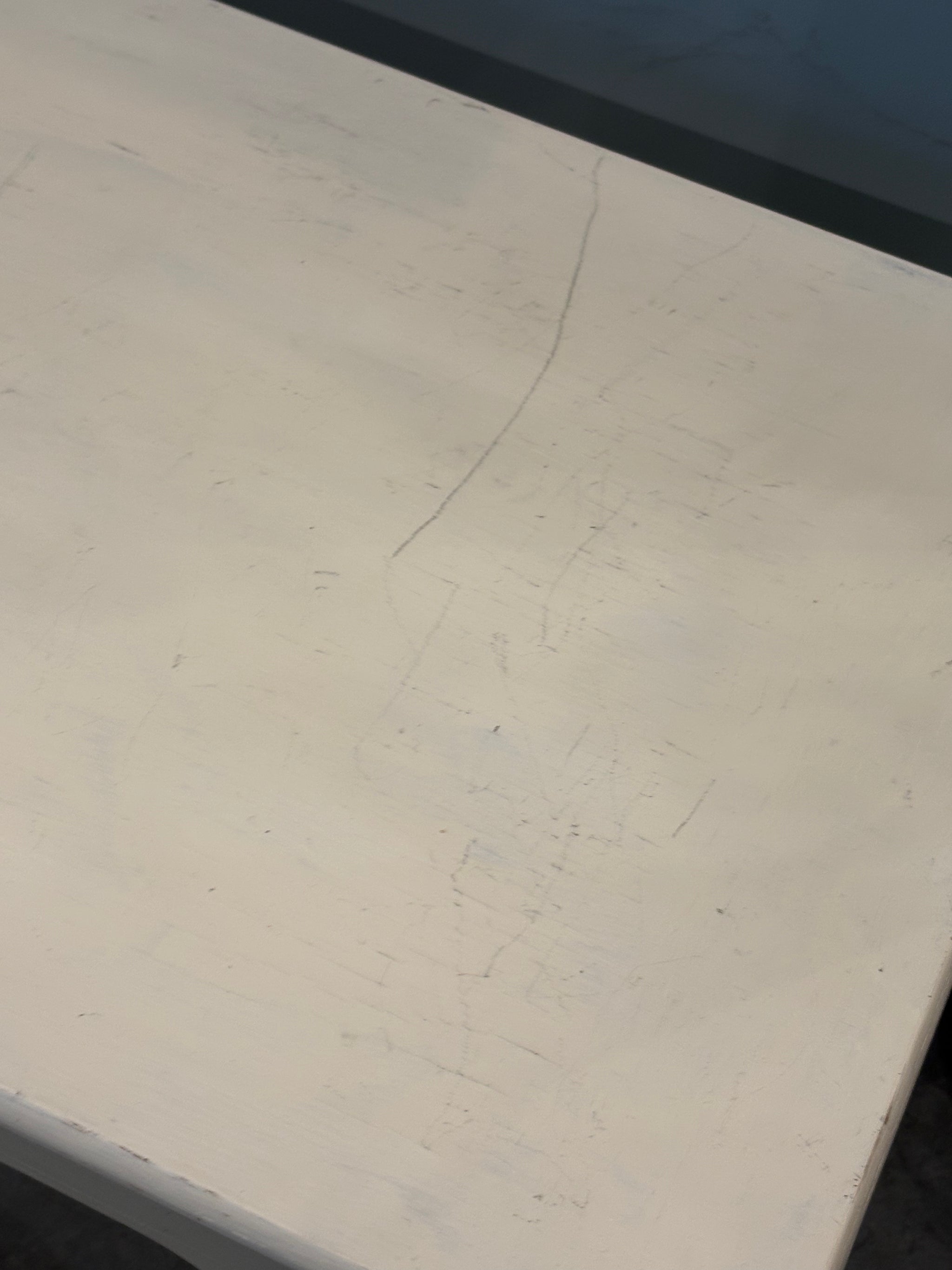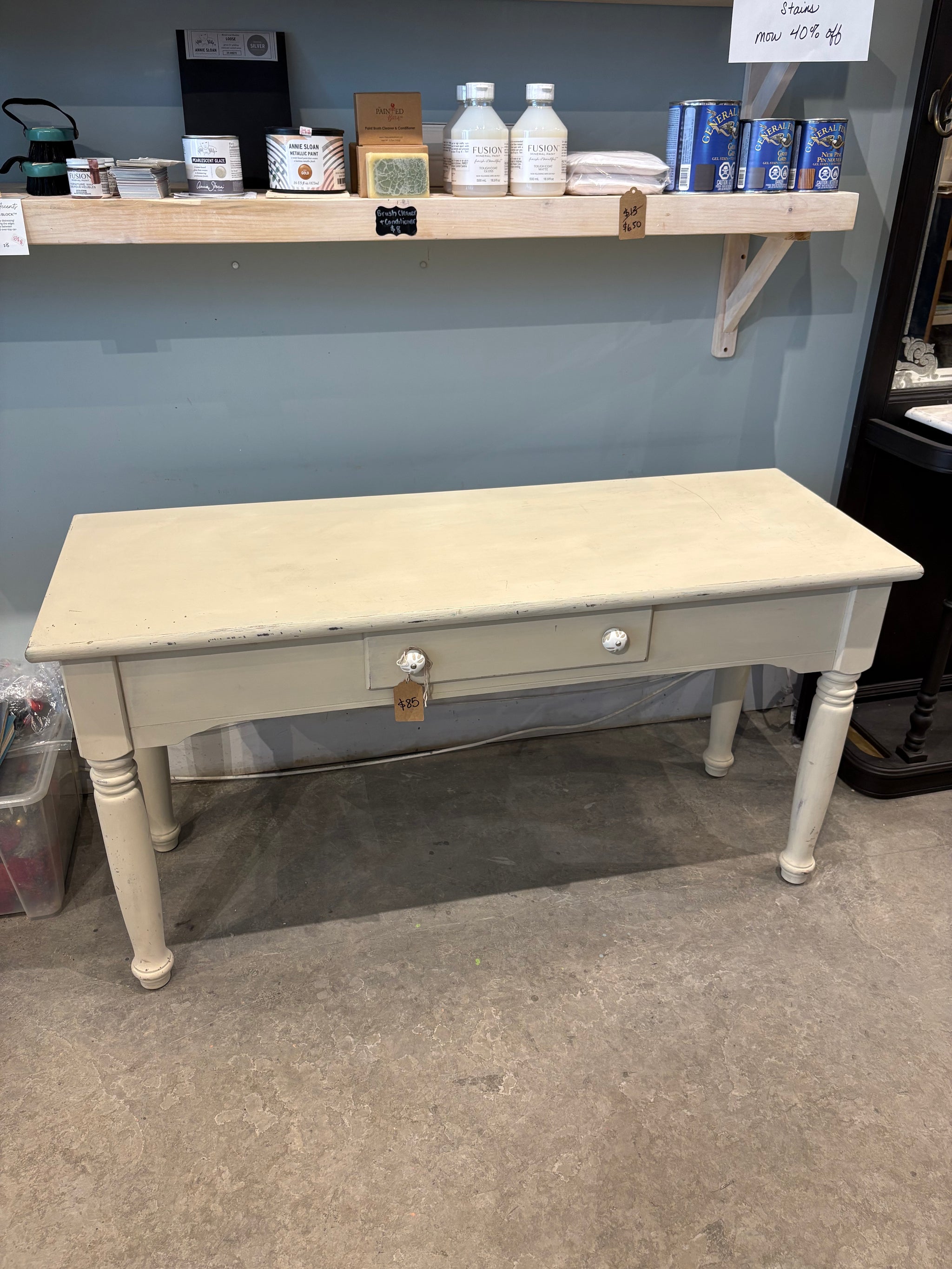 A long sold oak table that was used for displays. It need a paint job but is a solid table.