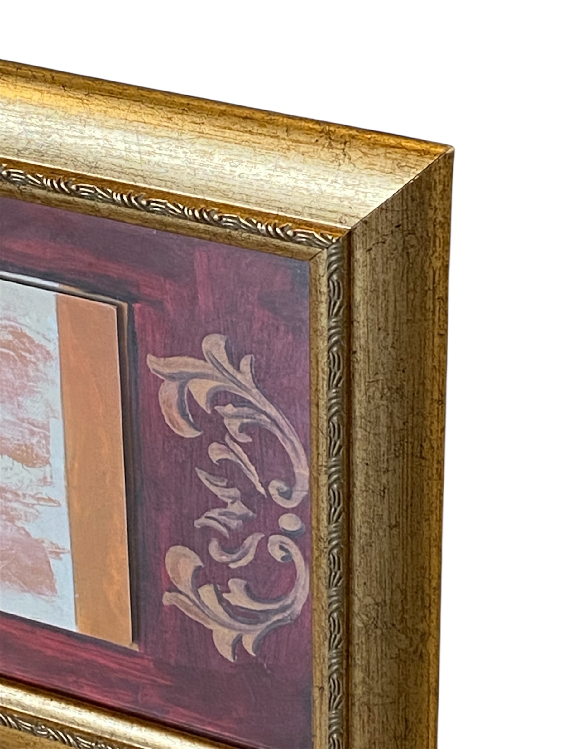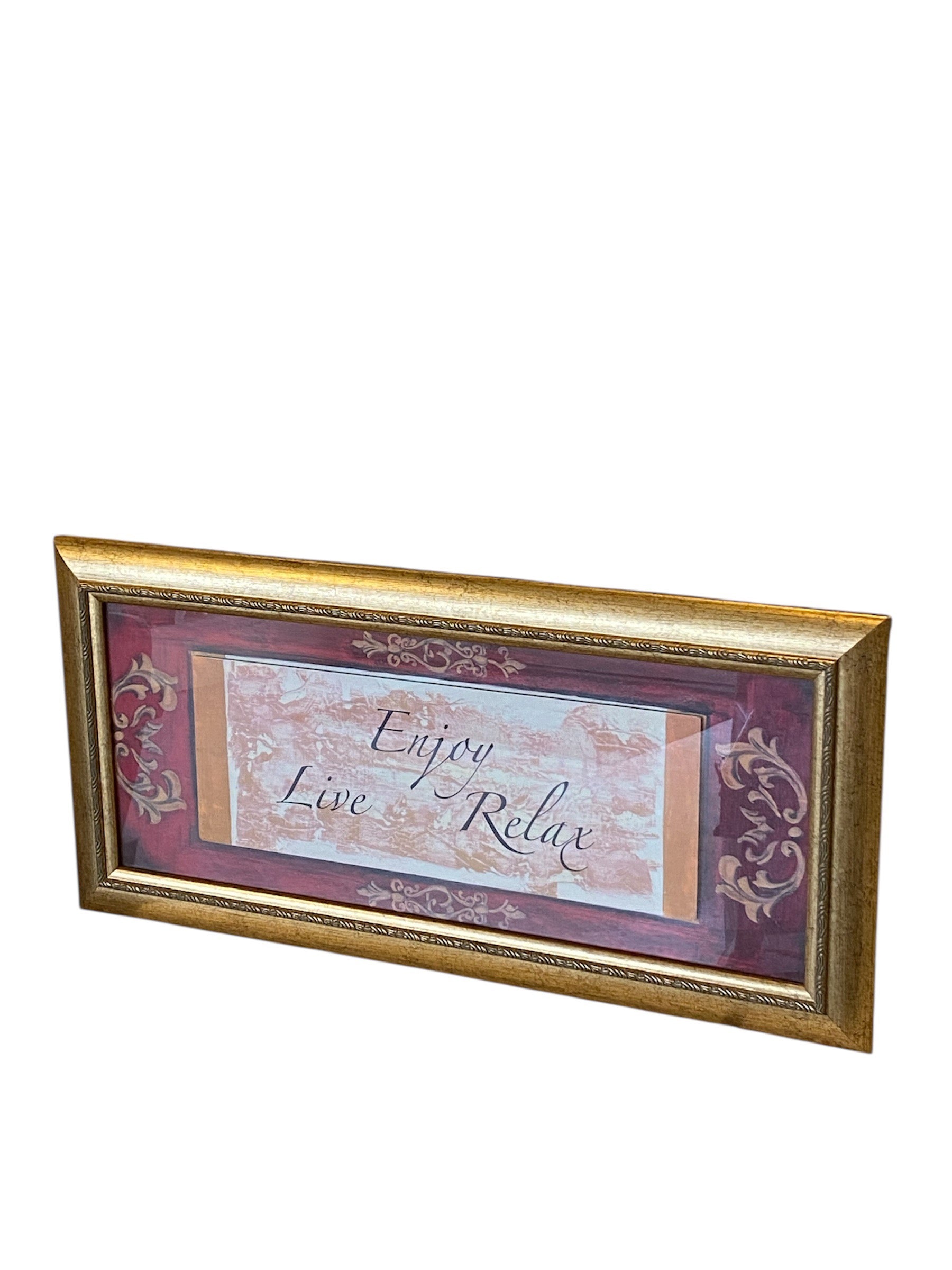 A lovely piece of reminder art that says Enjoy, Live, Relax in a gold coloured frame. The frame includes glass.