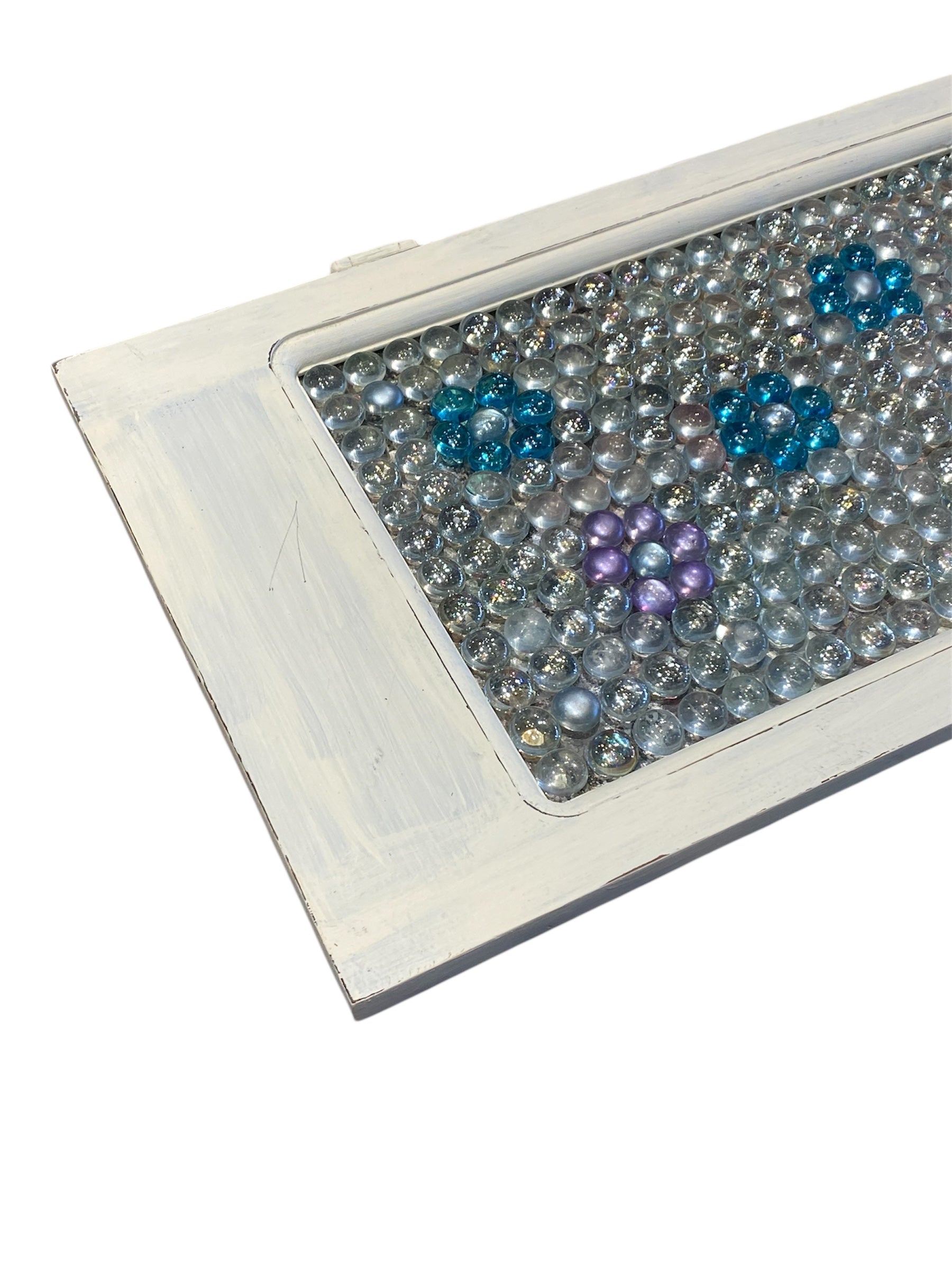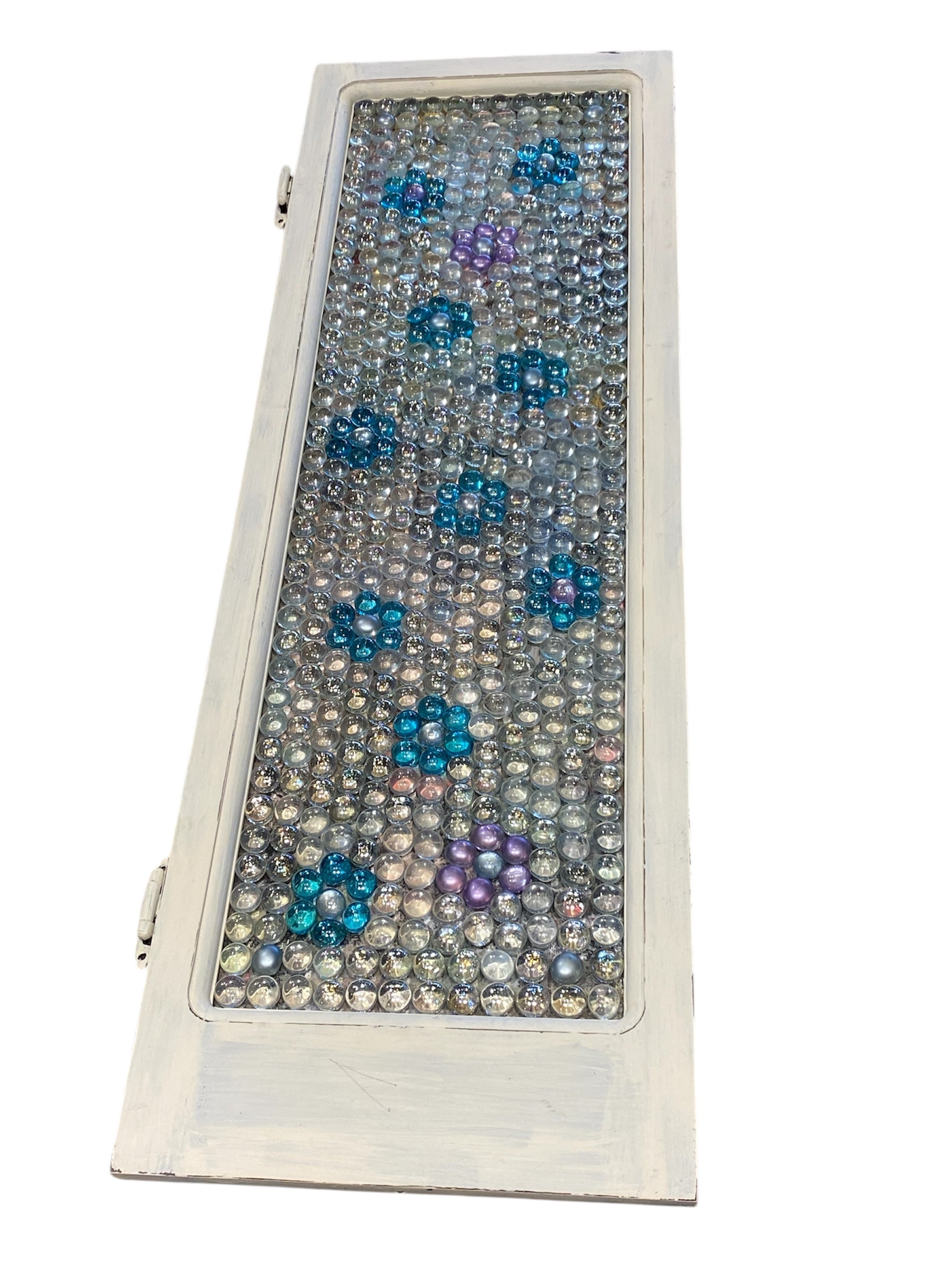 A beautiful reclaimed window recreated with glass beads. The glass beads create a lovely floral design. This pieces is very heavy but could be hung as a privacy screen or to reflect the light. It could also be laid against a window to allow the light to come through the beads.