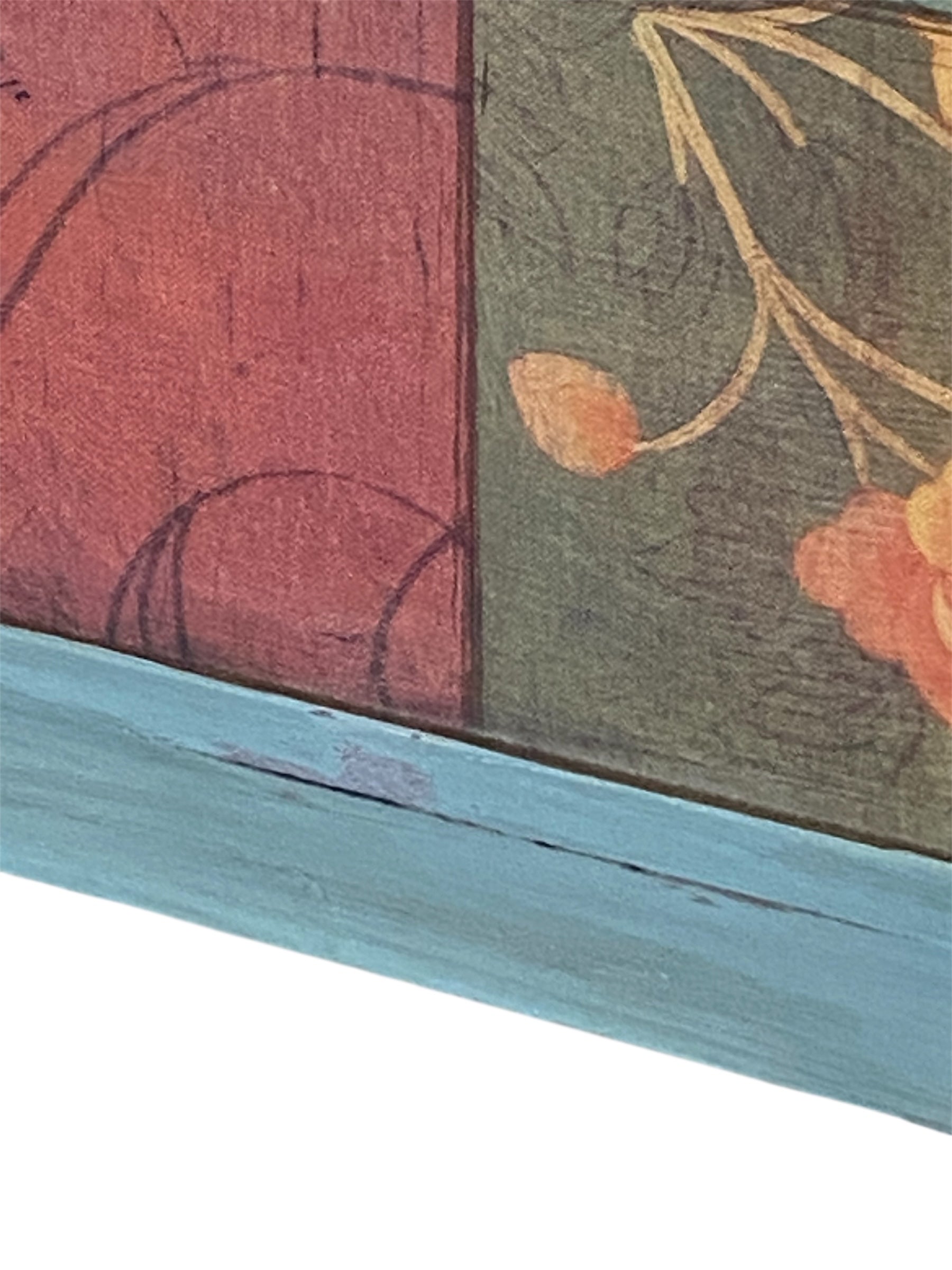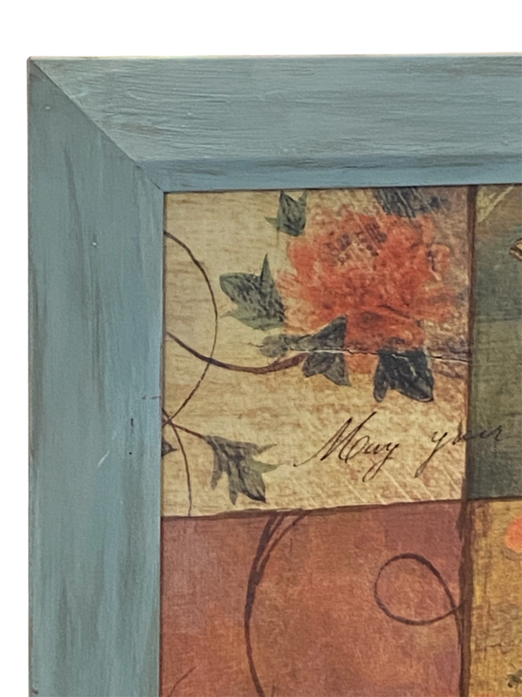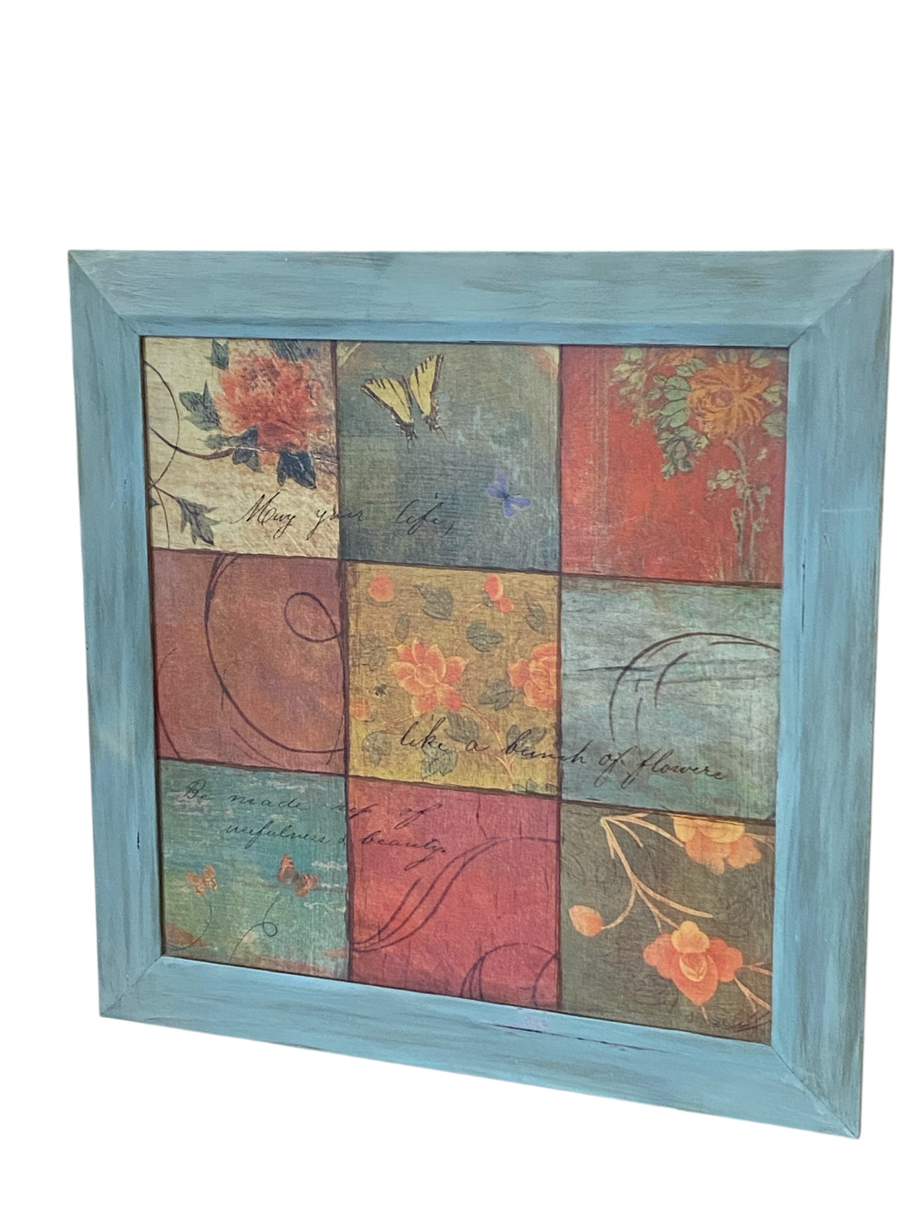 A beautiful piece of whimsical floral patchwork art that says "May your life, like a bunch of flowers be made up of usefulness and beauty". The frame has been painted and distressed.