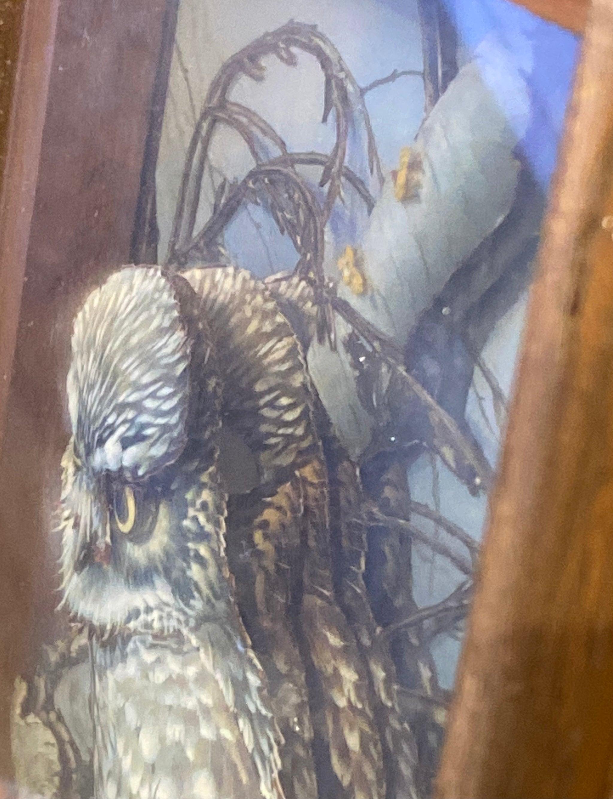 A vintage Basil Ede 3D paper art piece featuring a little owl sitting on a branch in a wood frame. This piece is from the late 1970's/early 1980's.
