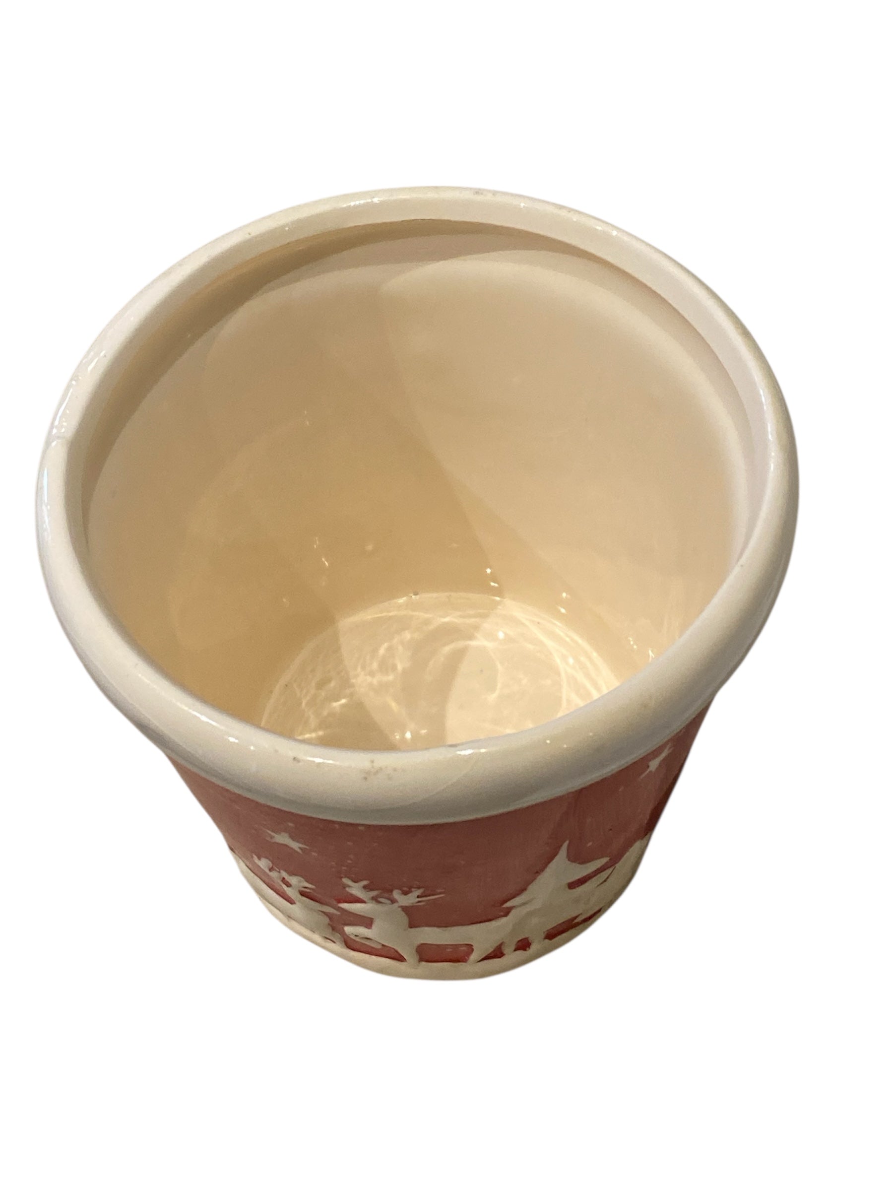 A charming vintage Christmas red and cream flower pot with reindeer, trees, and stars. No chips or cracks.