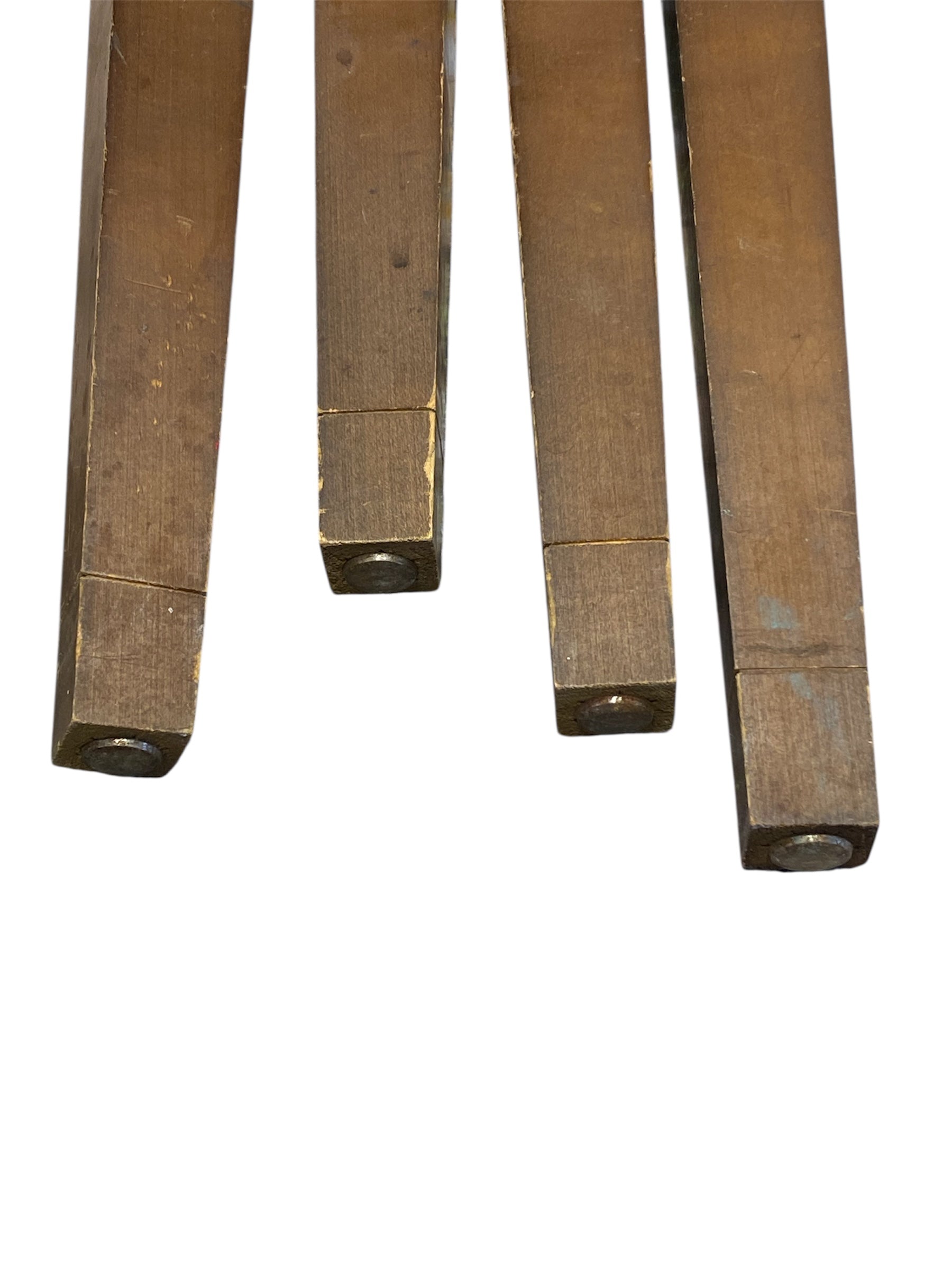 A set of 4 long reclaimed, solid wood, table legs with screws. The table legs could be used with the screws or drilled form the top and would be perfect for a reclaimed table or upcycling project. They have some wear and tear (see pictures).