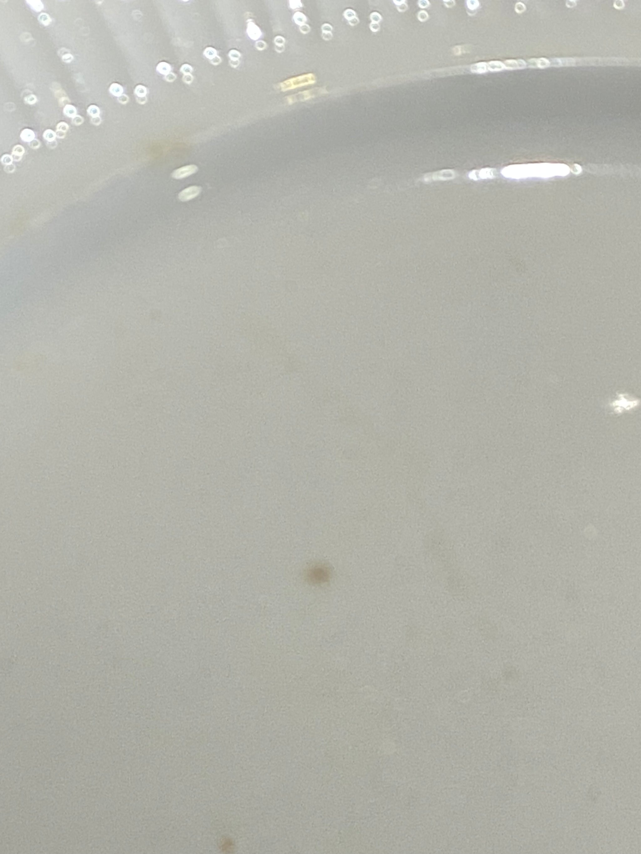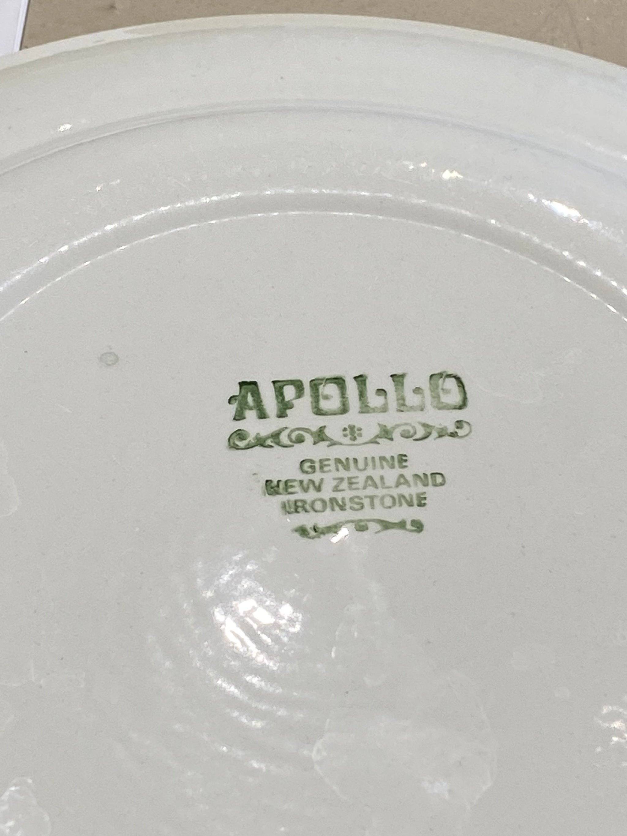 These mid-century ironstone white dinner plates feature ribbed rims and are made in New Zealand. Some grazing present and 2 small stains on one plate.